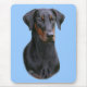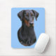 Ein schwarzer Dobermann Pinscher mit den natürlichen Ohren (uncropped) auf einem mousepad. Wählen Sie eine andere Hintergrundfarbe, indem Sie Customize>edit>background anklicken.