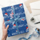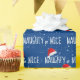 Weißer NAUGHTY- oder NICE-Text mit Schneeflocken und Kaps des Weihnachtsmanns auf blauem Hintergrund. Die Hintergrundfarbe kann geändert werden.