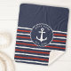 Diese stilvolle nautische Marine blau, weiß und rot Decke hat einen Template Text, um mit Ihrem Bootsnamen, Jahr oder anderen Redewendungen personalisieren. Das Design weist einen weißen Anker in einem Seilkreis auf einem gestreiften Hintergrund aus handgezeichnet Streifen auf.