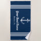 Das helle Strandtuch in horizontaler Form verfügt über einen eleganten Bootanker mit schönen horizontalen Streifen. Personalisieren Sie den benutzerdefinierten Text mit Ihrem Bootsnamen und Ihrer Position. Das Design umfasst ein klassisches marineblau-blaues und weißes Farbschema.