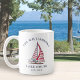 Créez une tasse à café maison unique personnalisée avec votre nom de famille et votre année avec un design élégant qui comprend des illustrations de voiliers avec voiles rouges et blanches.