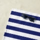 Das Strandtuch des Kapitäns wird individuell mit Ihrem Namen gestaltet. Das Design zeigt einen zeichn eines marineblauen Ankeres mit Seil in der Mitte und marineblau-weiße Streifen oben und unten.
