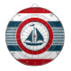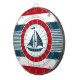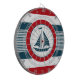 Schönes Design mit runder Dekoration der Segelboote auf blau, rot und weiß gestreiftem Hintergrund