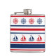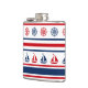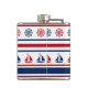 Schönes Design mit Segelboot und Kompassdekoration auf rot, blau und weiß gestreiftem Hintergrund