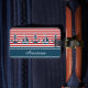Schönes Design mit Segelboot und Ankerdekoration auf rot-weiß gestreiftem Hintergrund