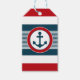 Nautical design with anchor decoration in round shape on blue, red and white striped background