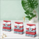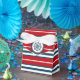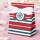 Nautisches Design mit Kompassdekoration in runder Form auf rot, blau und weiß gestreiftem Hintergrund