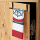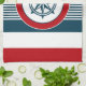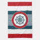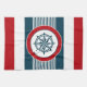 Schönes Design mit Kompassdekoration in runder Form auf blau, rot und weiß gestreiftem Hintergrund