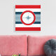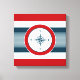 Schönes Design mit Kompassdekoration in runder Form auf blau, rot und weiß gestreiftem Hintergrund