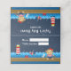 Diese niedliche und unterhaltsame Platzkarte verfügt über einen Seemannsmädchen auf einem Holzdeck mit Seemöwe und Krabbe. Im Hintergrund befindet sich ein roter und weißer Leuchtturm, ein niedlicher Vogel auf einem Segelboot, Meereswellen und ein marineblauer Sternenhimmel. Der Text verbindet fett- und serifenlose Schriftart für ein stilvolles und modernes Aussehen. Das ist ideal für eine Babydusche zum Thema Wassersport.