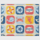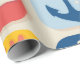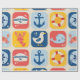 Ein spielerisches Gittermuster mit charmanten nautischen Ikonen wie Ankern, Möwen, Walen, Krabben und Rettungsleinen. Die farbenfrohen roten, gelben und blauen Blöcke schaffen ein lebendiges und lebendiges maritimes Thema.