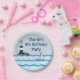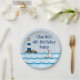 Individuell gestaltete Kinder Geburtstagsparty Teller mit digitaler nautischer Szene eines Segelbootes in einem welligen Ozean an einem Stripey Leuchtturm vorbei.