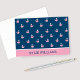 Les cartes de notes pliées ou de remerciement comportent du texte personnalisé et un motif de petites baleines. Les couleurs comprennent : bleu marine, rose, rose clair et blanc.