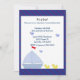 Ein niedliches segelschiff in weichem blau mit kleinen gelben Enten im Wasser und blauen Vögeln im Himmel. Ein blau-rot diagonal gestreifter Rahmen. Passen Sie Ihre Babydusche nach Wunsch an.