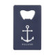 Carte de crédit nautique minimaliste moderne Bottle Opener avec ancre blanche avec nom personnalisé en blanc moderne sans serif style police sur arrière - plan bleu marine. Parfait comme cadeau pour papa, groomsmen, cadeau de réunion de famille et plus encore.