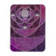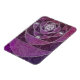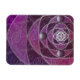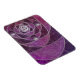 Ein farbiges Glasdesign aus silbernen Spiralen und Pflaumenfarben, über eine sich wiederholende Kulisse von spiralförmigen Fraktalen. Die silbernen Spiralen vereinigen sich in ein silbernes Rose-Design mit runden Edelsteinen für Akzente.