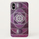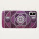 Ein farbiges Glasdesign aus silbernen Spiralen und Pflaumenfarben, über eine sich wiederholende Kulisse von spiralförmigen Fraktalen. Die silbernen Spiralen vereinigen sich in ein silbernes Rose-Design mit runden Edelsteinen für Akzente.