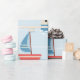 Ein charmantes nautisches Muster mit farbenfrohen Leuchttürmen, Segelbooten und Bojen auf hellblauem Hintergrund. Die skurrilen Illustrationen bringen das Wesen der maritimen Erkundung und des Küstencharmes zum Leben.