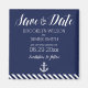 Nautische Hochzeit Sichern Das Datum Magnete mit blau-weißen Streifen, weißem Anker und veränderbarem weißem Text auf marineblau