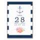 Trendige nautische Hochzeitskarten mit einem floralen Aquarellanker, Blume und Marinestreifen. Die Tischnummer ist in einem angesagten Stil gehalten.