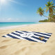 Dieses einfache und dennoch auffällige Strandtuch mit einem blau-weiß gestreiften Hintergrund und einer eigenen Monogramm ist für die Marine vorgesehen.