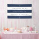 Herzlich willkommen bei Ihrem Probe-, Sommer- oder Küstenabend mit einem marineblau-weiß gestreiften Banner. Personalisieren Sie den Text in drei Zeilen mit zwei weißen Ankerabbildungen. Showdown mit "morgen wir tun! Glückwunsch [Name] und [Name]."