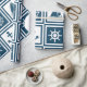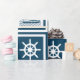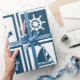 Nautisches Design mit Segelrad, Segelboot, Kompass und Ankerdekoration in weiß-blau gestreiften Quadraten