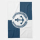 Nautisches Design mit Anker- und Lorbeerkraendekoration über blau-weißem geometrischem Hintergrund
