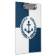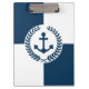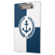 Nautisches Design mit Anker- und Lorbeerkraendekoration über blau-weißem geometrischem Hintergrund