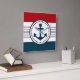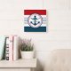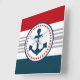 Schönes Design mit Ankerverzierung in runder Form auf blauem, rotem, grauem und weißem, gestreiften Hintergrund