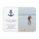 Nautical Foto speichert den Datums-Magneten, der auf der rechten Seite Ihr Lieblings-Vertikalbild zeigt. Auf der verlassen Seite befindet sich ein marineblauer Anker mit dem Monogramm auf beiden Seiten. Unten sind Ihre Namen und die Worte, "binden den Knoten", über einen weißen Hintergrund. Dieses einfache Design ist ideal für eine Hochzeit am Strand im Sommer.
