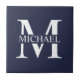 Personalisierte Monogramm- und Namensgeschenke mit personalisiertem, weißem Monogramm im klassischen Serif-Schriftart-Stil mit einem Namenskasten in der Mitte des Monogramms auf marinebasischem Hintergrund.