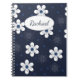 Pretty navy blue and white modern floral pattern on personalised notebook.