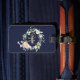 Hübscher monogramm Gepäckanhänger mit einem schönen Skriptnamen mit einem vergoldeten Initial, der durch eine zarte Aquarellgarland mit blühender Rose auf marinebaublauem Hintergrund gerahmt ist. Entwickelt von Thisisnotme©