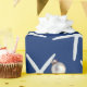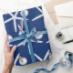 Navy, tropische Weihnachtsverpackung mit großen Seestern und Ornamenten Muster. Weiße, fünfbeinige Seesterne mit einem silberfarbenen, weißen Baumschmuck aus einem Bein, bedruckt über dunkelblau, hochwertige Geschenkverpackung. Wählen Sie eine benutzerdefinierte Rolle.