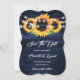 Rustic navy blue and sunflower wedding save the date card featuring sunflowers on a rustic wood background adorned with string lights. Two burlap hearts at the back. Matching items available.