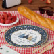 Weihnachts-Party-Papier-Teller mit modernen, schlichten, blauen Weihnachtsbäumen und gepunkteten Mustern in der gleichen Farbe. Personalisieren Sie den Text einfach oder verließ Sie ihn leer - Kate Eden Art