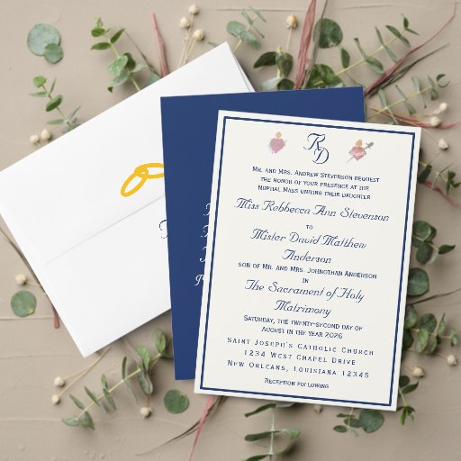 Navy-Blue Two Hearts Catholic Wedding Invitation Einladung