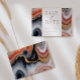 Contemporain enregistrez l'invitation de date avec un carré blanc dans lequel toutes vos informations sont élégamment écrites sur un arrière - plan abstrait en marbre d'agate. Les détails de l'agate sont dans les tons orange et bleu avec des accents dorés. Consultez notre magasin pour plus d'articles de cette collection mariage.