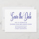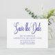 Elegantes und zeitloses marineblau-weißes Design. Save the Date ist in einem schönen Skripttext geschrieben. Ihre Namen, Ihr Hochzeitstermin und Ihr Standort folgen. Sie können eine zusätzliche Meldung auf der Rückseite hinzufügen.