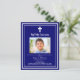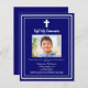Ein marineblauer Hintergrund, mit weißem Rahmen dekoriert, ein weißes Kreuz Persönlich und fügen einen Namen und Details des Fotos hinzu. Weißer Text. 1 Blatt = 1 Einladung mit Druckkante bis Kante.