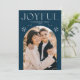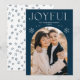 Wish loved ones a happy holiday season by sending them a trendy holiday card designed by Late Bloom Paperie! Die einzige Holiday card feys your foto inside of a navy arch foto frame. "Joyful" is displayed at the top in white modern lettering accented by hand-drawn snowflakes. Personalize the front of the Christmas foto card by adding your name and the year. The back of the foto holiday card displays a navy snowflake pattern.