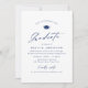 Navy blue and white simple graduation invitation with modern hand written calligraphy and grad cap, personalized photo on the back, simple and unique. Custom it with your own photo and grad party information.