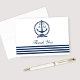 Modern and preppy nautical wedding thank you note card design feature a wedding monogram displayed inside a boat anchor with rope knot and stripe details. Navy blue and white color scheme.