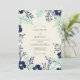 This design features a sophisticated botanical border with deep navy blue cosmos flowers and delicate seafoam green foliage. The ivory backdrop creates a clean, polished look suitable for a formal spring or winter event. Rich watercolor textures bring the leaf sprigs and petals to life, offering a timeless nature-inspired aesthetic.
