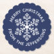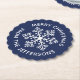 Eine weiße Schneeflocke auf einem marineblauen Hintergrund mit "Frohen Weihnachten" aus der Familie in einem Kreis darum herum.