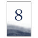 Die chic-coastal-Tischnummer-Karten in tiefblau-weiß-dunkelblauen Tönen zeichnen sich durch eine Aquarellwäsche am unteren Rand aus, die den Gezeiten und Ebbe ähnelt. Design wiederholt sich auf der Rückseite. Koordiniert mit unserer Hochzeitssuite Navy Tides.