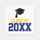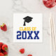 Dekorieren Sie Ihren Party-Tisch mit diesen Navy und Gold Class von 2024 Graduation Party Napkin. Personalisieren Sie das Jahr Ihres Absolventen. Es verfügt über 'Class of 20xx' in Marine und Gold und ein schwarzes Grade Cap.