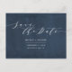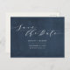 Navy Blau + Weiß elegante Hochzeit Save the Date Postkarte. Modernes, minimales Skripttextdesign. Teil einer Sammlung.
