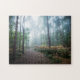 Dieses Foto kennzeichnet eine Bahn durch ein dunkles nebeliges Holz in Norfolk, Großbritannien.